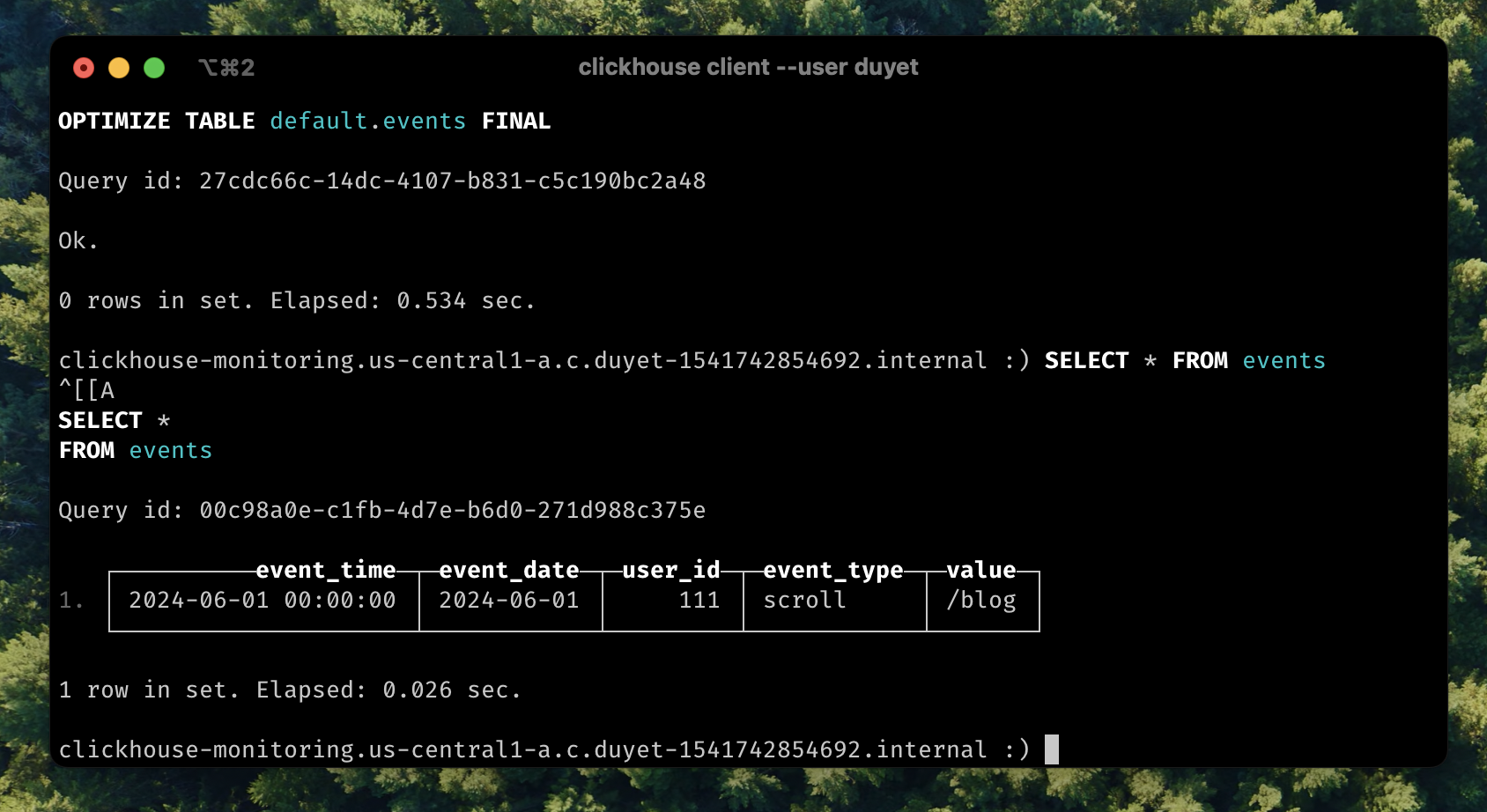 When using the clickhouse client binary in the terminal, you can see that the returned data is separated into two blocks because the data has not been merged yet. Check the number of parts: